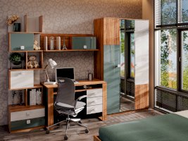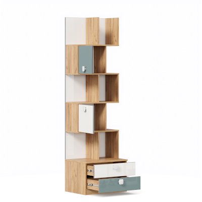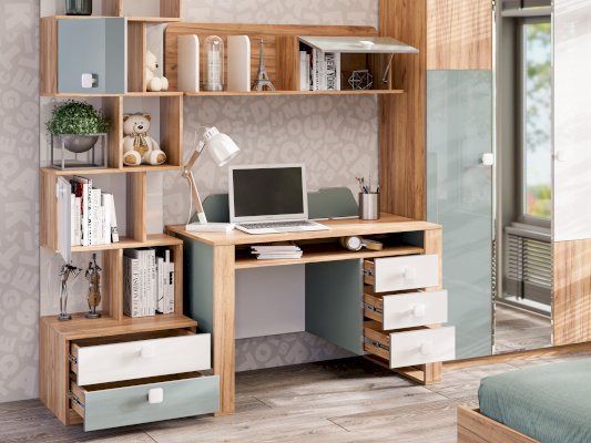 • Над ящиками, система из полок и перегородок, образующих ниши для хранения: 2 ниши 396х328 мм за распашными фасадами и открытые секции, высотой 328 мм