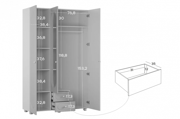Шкаф оснащён тремя распашными дверями: две крайние двери выполнены из МДФ, а средняя дверь дополнена зеркалом, которое визуально расширяет пространство и делает комнату светлее. В нижней части предусмотрены два выкатных ящика, подходящих для хранения белья, аксессуаров или повседневных вещей.