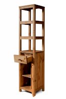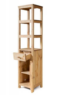 Открытый, сквозной пенал в верхней части. За дверкой одна полка. Выдвижной ящик.